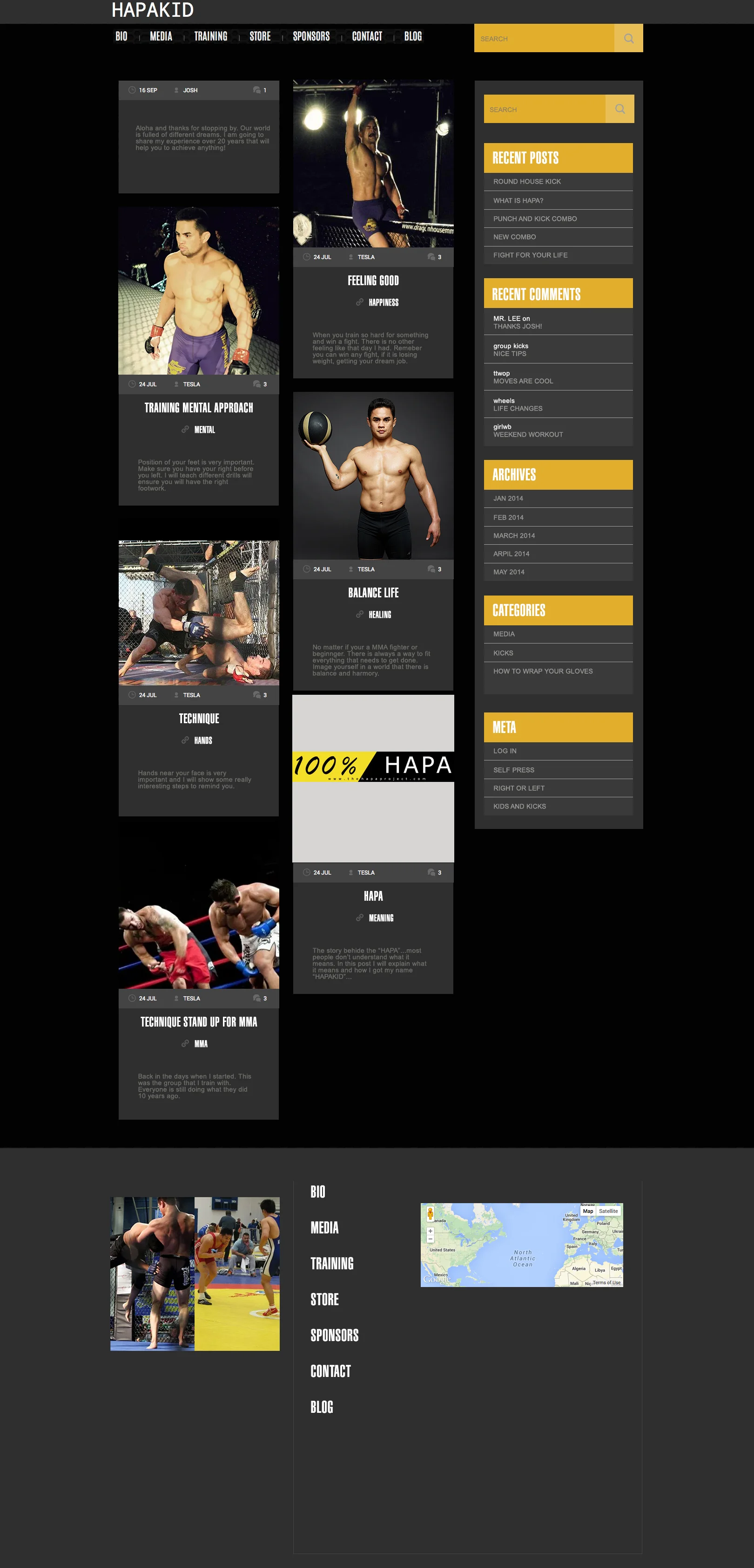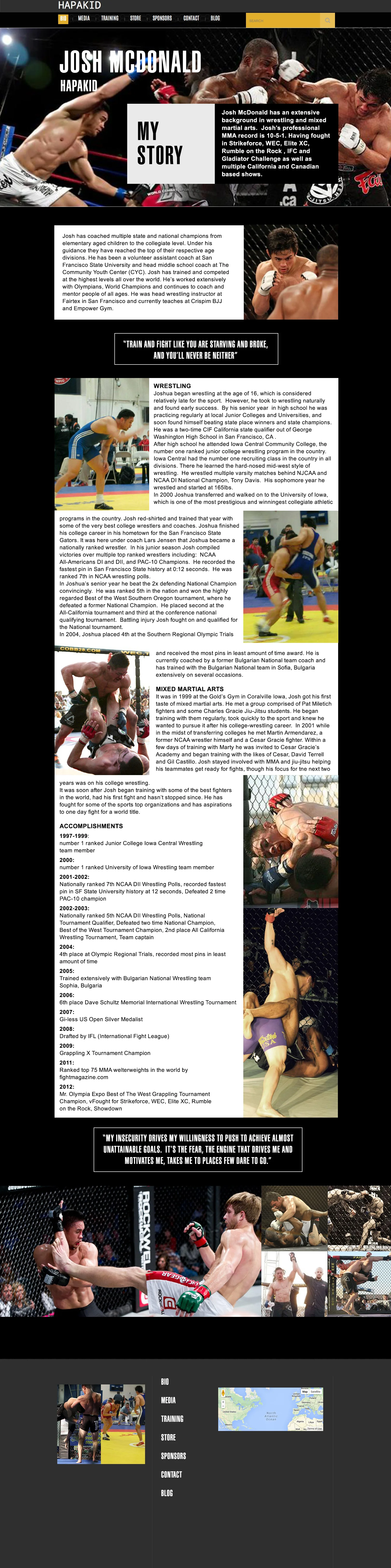 Josh McDonald is a MMA fighter who helms from his grassroots from Hawai'i. He wanted his website to portray his victories and philosophy. This is an outlet where he is able to share his own experiences of having an active lifestyle. The colors stem from his love of the islands and his alumni from SFSU. I balanced the colors with the layout to make sure everything had an open space with the information.