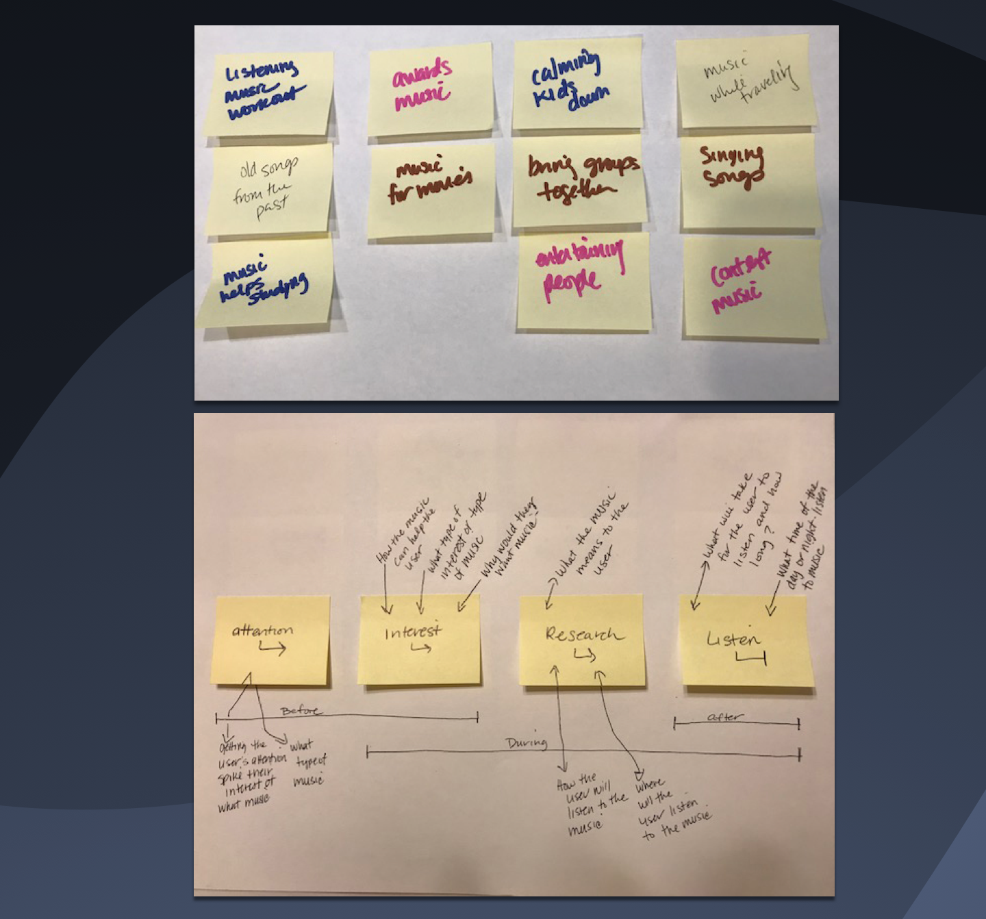 I wanted to understand the user’s needs and what drives them to listen to music. So I created a journey map for various users that includes a description of complex evaluation for each participant. Below illustrates the stages, services and touch points through a user’s journey.