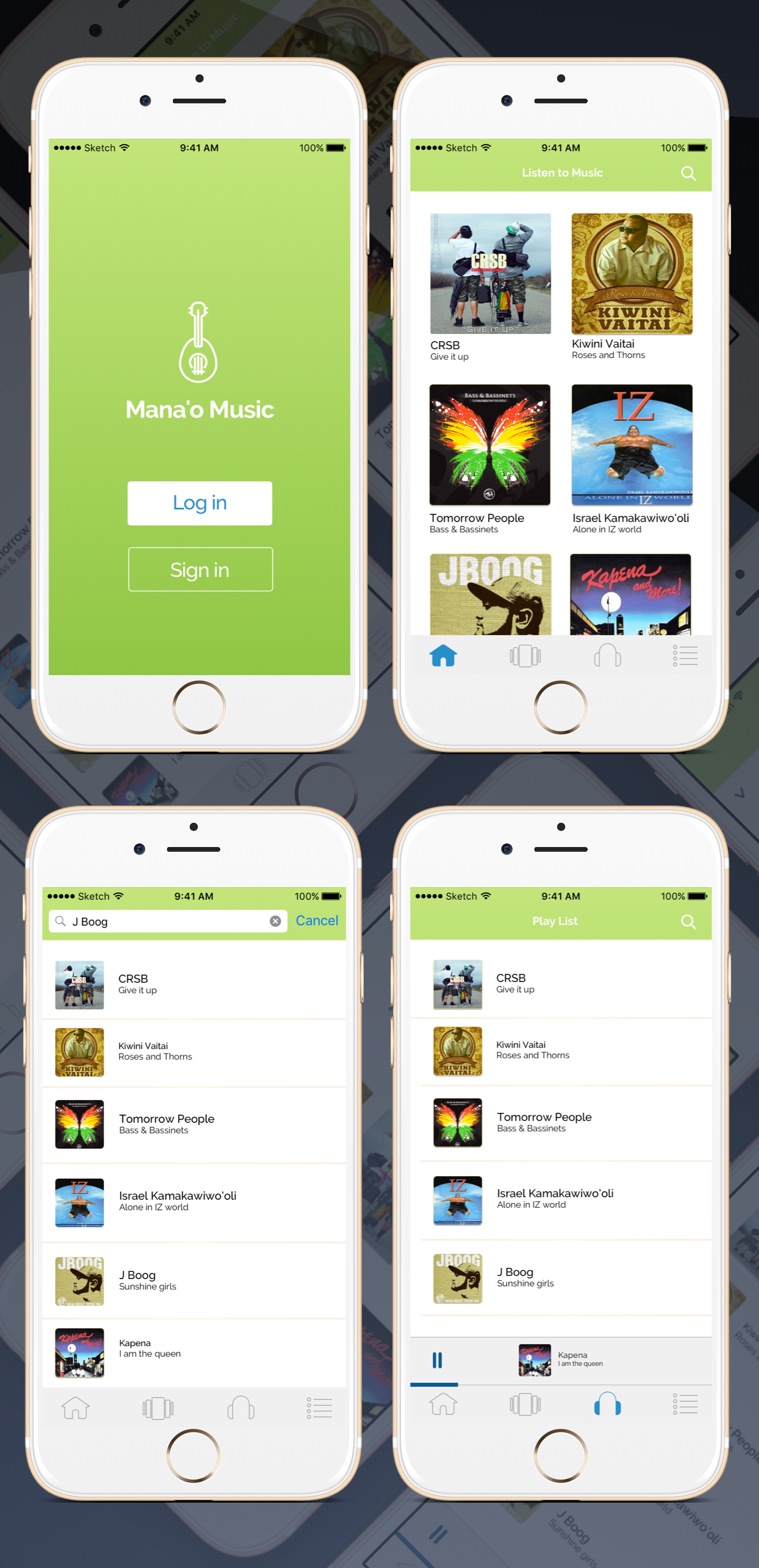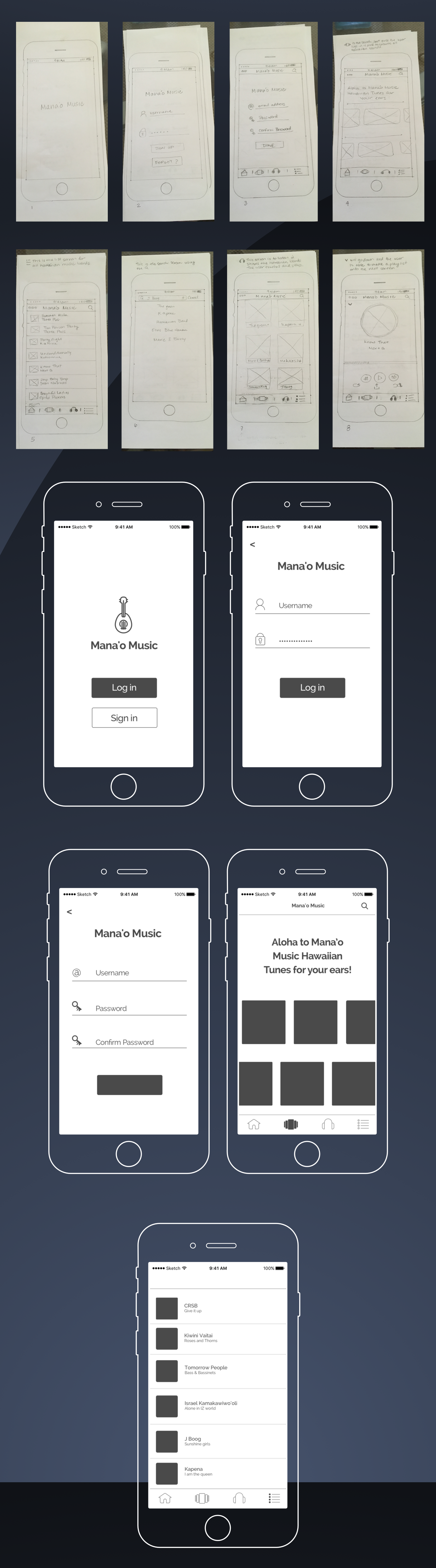 The Mana’o Music app was built with each section being designed for mobile. The whole process involved creating prototypes of the application using a prototyping tool called InvisionApp. These prototypes were tested by users so that I could get initial design feedback. After the first round of testing, I made changes to the prototypes that reflected changes desired by the participants. The main take away from testing was that the playing loop feature was not visually clear enough for the user to actually understand how it worked. Next, I conducted a usability test with 4 different participants using paper prototyping. After incorporating their feedback, I ran one last user test with a revised version of the InvisionApp prototype. With their comments, I made final revisions to the mobile wireframes. Lastly, I polished all final screens and made an interaction prototype in an app called Principle.